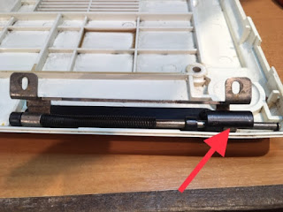 原因は前面カバーの開く時に右に動かして開けるのですが、右に動かすのが不充分で開くと矢印部分が手前に曲がってしまいます。